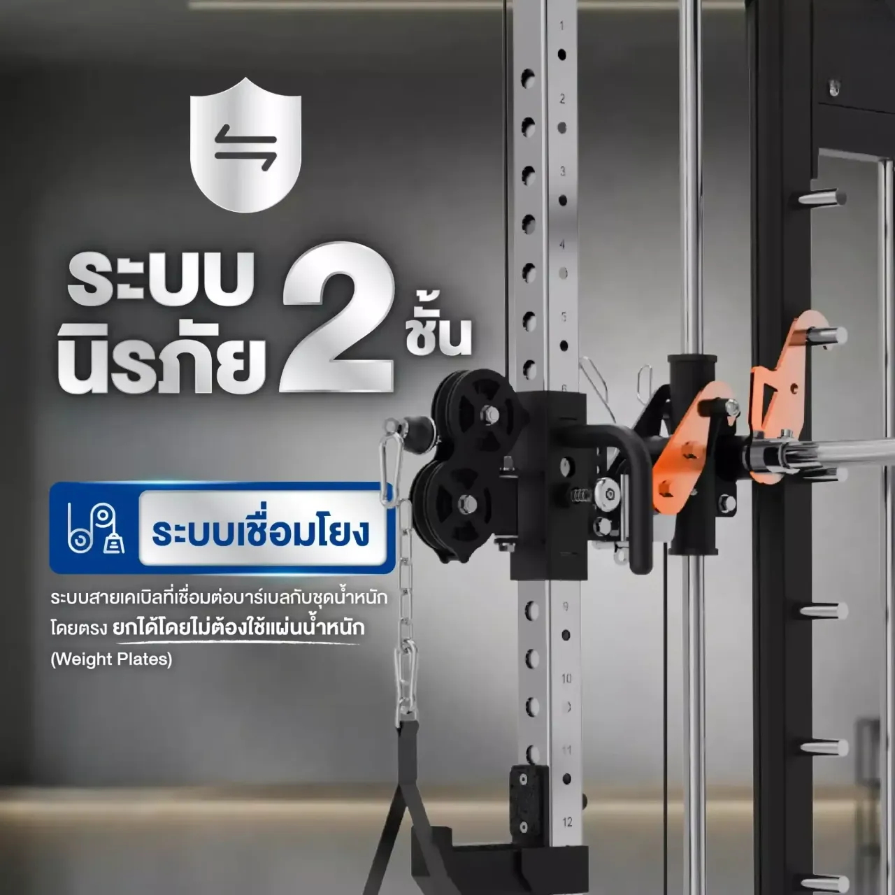 รวม Smith Machine, Dual Pulley และ Half Rack ช่วยให้ฝึกได้ครบทุกมัดกล้าม - ระบบความปลอดภัยแบบ Double Safety