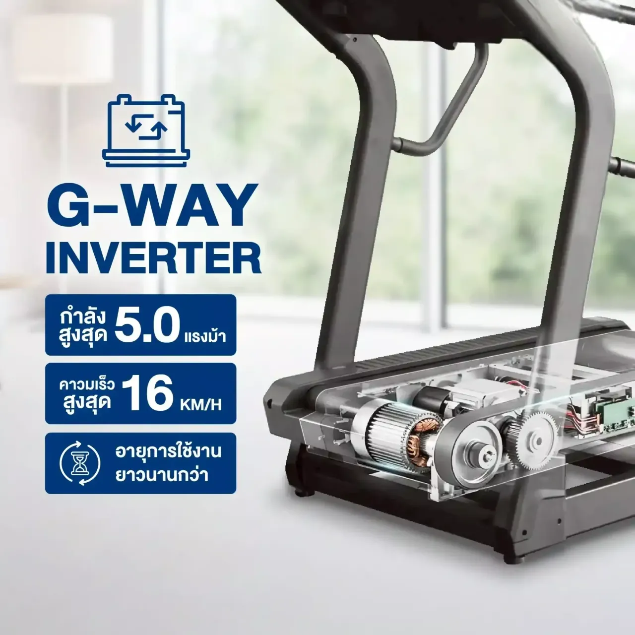 จำลองทั้งการขึ้นเขาและลงเขา ช่วยเพิ่มแรงต้าน เผาผลาญพลังงาน และเสริมกล้ามเนื้อขาได้ดีกว่าลู่วิ่งไฟฟ้าทั่วไป - มอเตอร์ G-WAY Inverter DC Motor 5.0HP / 3.0HP